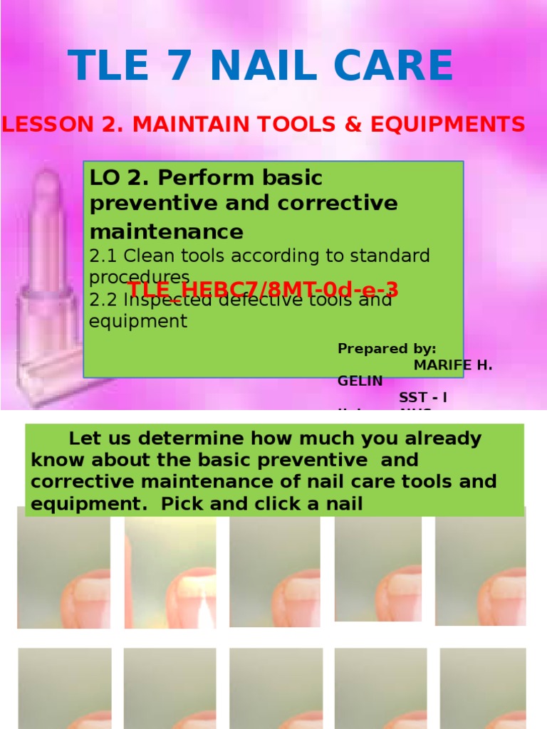 Tools and equipment in cleaning nails. NAIL CARE TOOLS and EQUIPMENT By. TOOLS are the Articles used in any nail care service which are durable or permanent and are hand-held. Contractor Supplies in Brownsburg serving Indianapolis West Side.