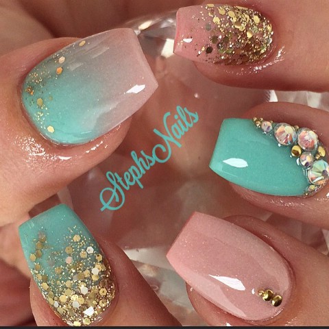 Light Blue Teal And Rose Gold Nails Rose Gold Nails Acrylic Teal Nails Gold Acrylic Nails