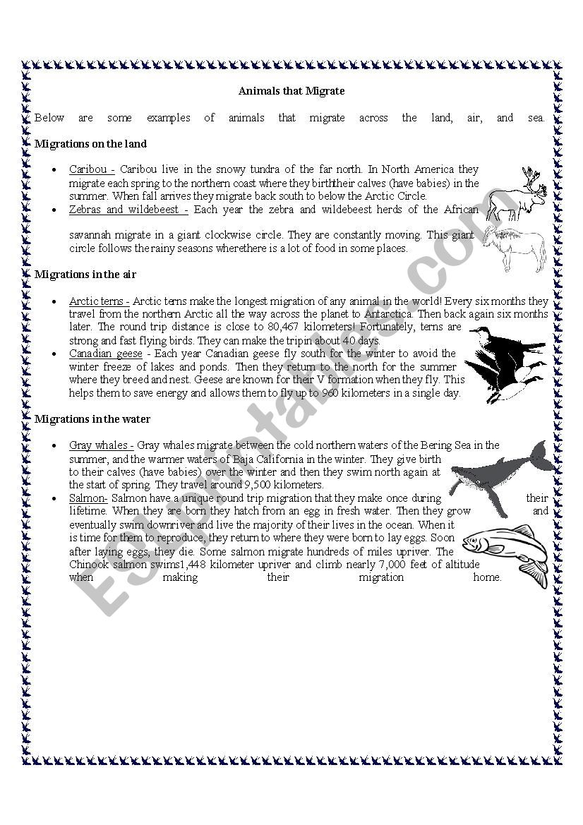 Animal Migration Reading Comprehension Esl Worksheet By Vanedeakin84