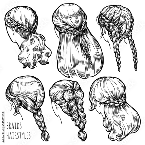 Set Of 6 Women S Braids Hairstyles Vector Isolated Sketch Style Illustration Hand Drawn Stock Vector Adobe Stock