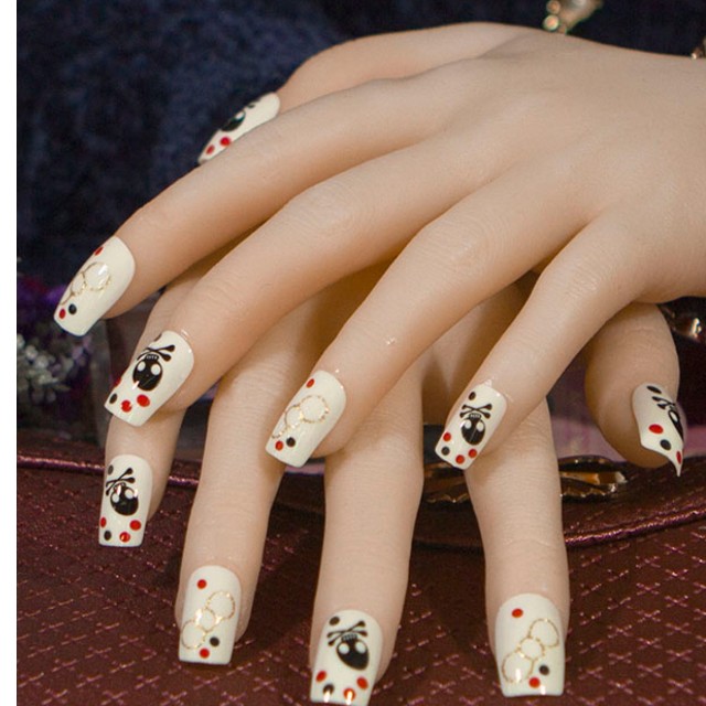 White nail enamel can give you a very stylish set of nails. My white is a softer white than my wifes and a little closer to natural white of nail tips. Let the beauty of black shine with the incorporation intricate flowers and beads.
