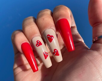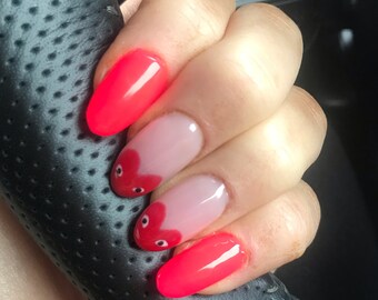 Available in a range of lengths and sizes - please choose this from the drop down box. Custom press on nails in nude with red hearts. However the leaf shape is oval shaped.